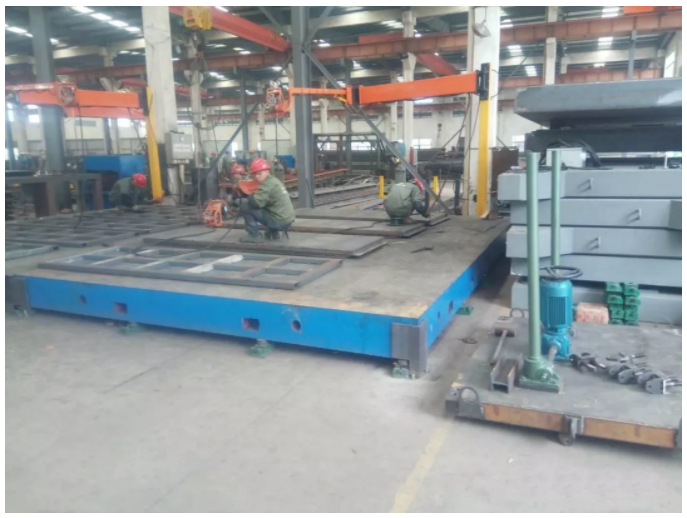 在人防門框和門扇鋼框在制作流程中及雙扇門在裝配過程中,由于受到生產工藝、場地限制等原因,需要使用鑄鐵平臺。一般使用的鑄鐵平臺為4mX6m,如有特殊人防門型號,還需要定制不同大小的鑄鐵平臺。
